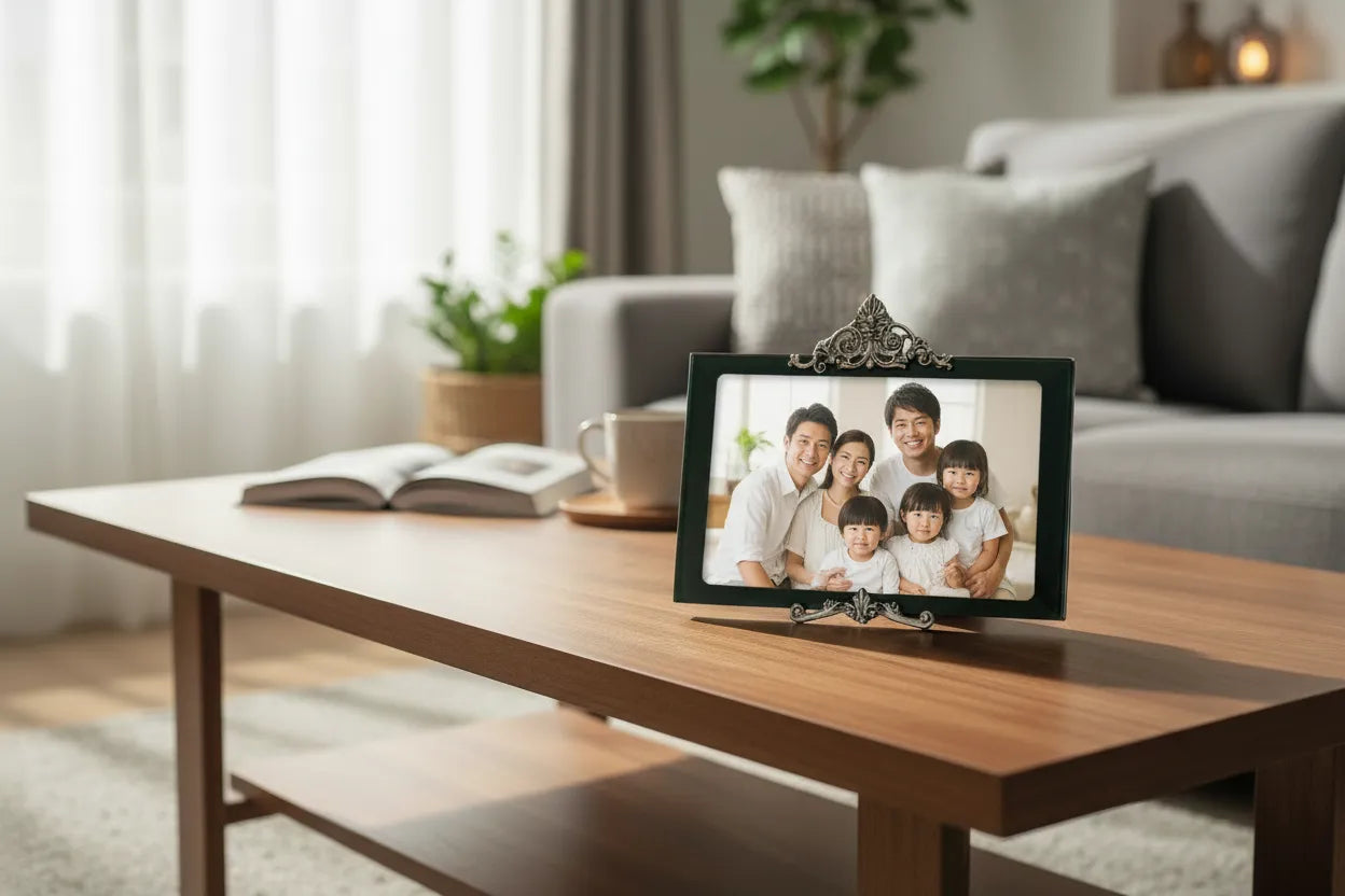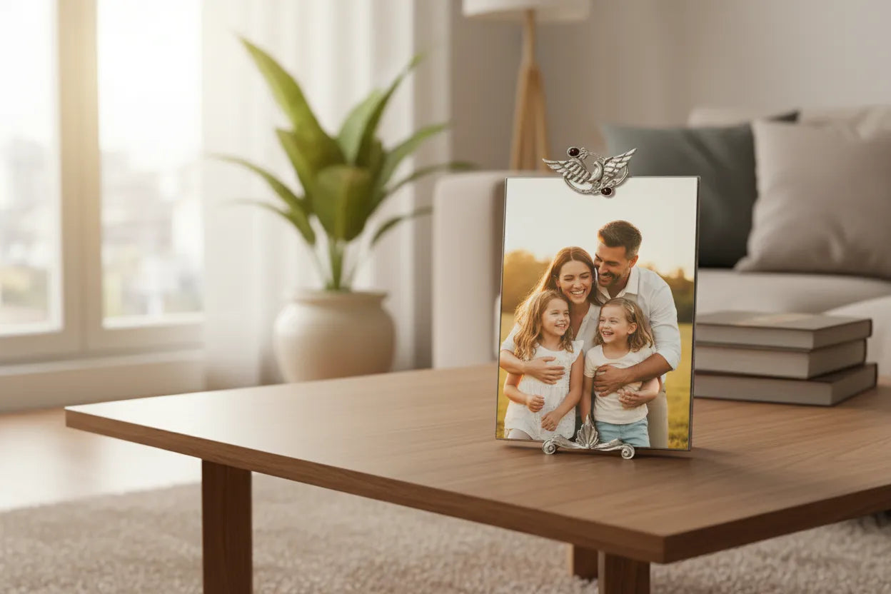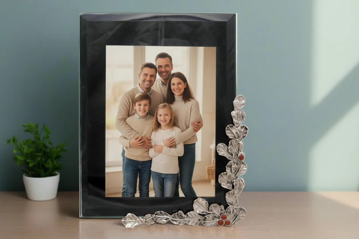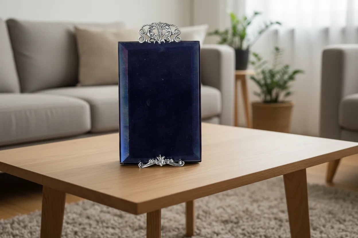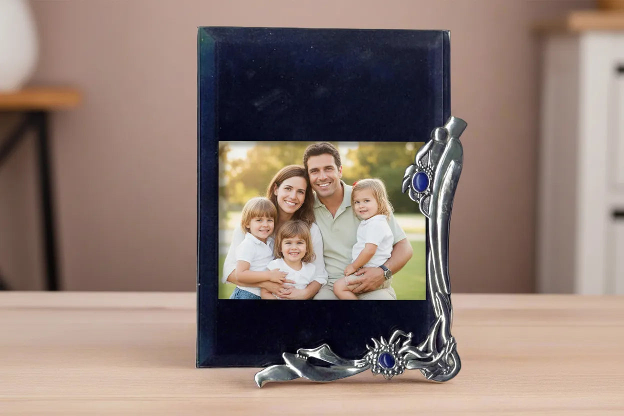 The back cover of the frame is made of velvet and the front of crystal glass. All frames can be positioned either upright or lying depending on the photo. Available in three different sizes.