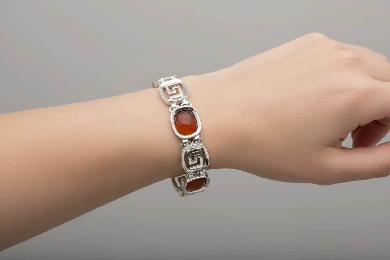 Greek Key Meander Bracelet in Sterling Silver with carnelian (B-65)