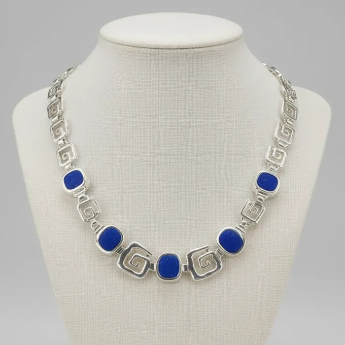 Greek Key Meander Necklace in Sterling Silver with lapis lazuli (PE-19)