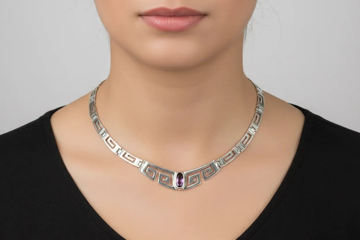 Greek Handmade Sterling Silver Jewelry for women, all inspired by the Ancient Greek Tradition. Decorated with motifs like the Greek Key (Meander),and with semi-precious stones, mostly Lapis Lazuli, Amethyst, Zircon etc).