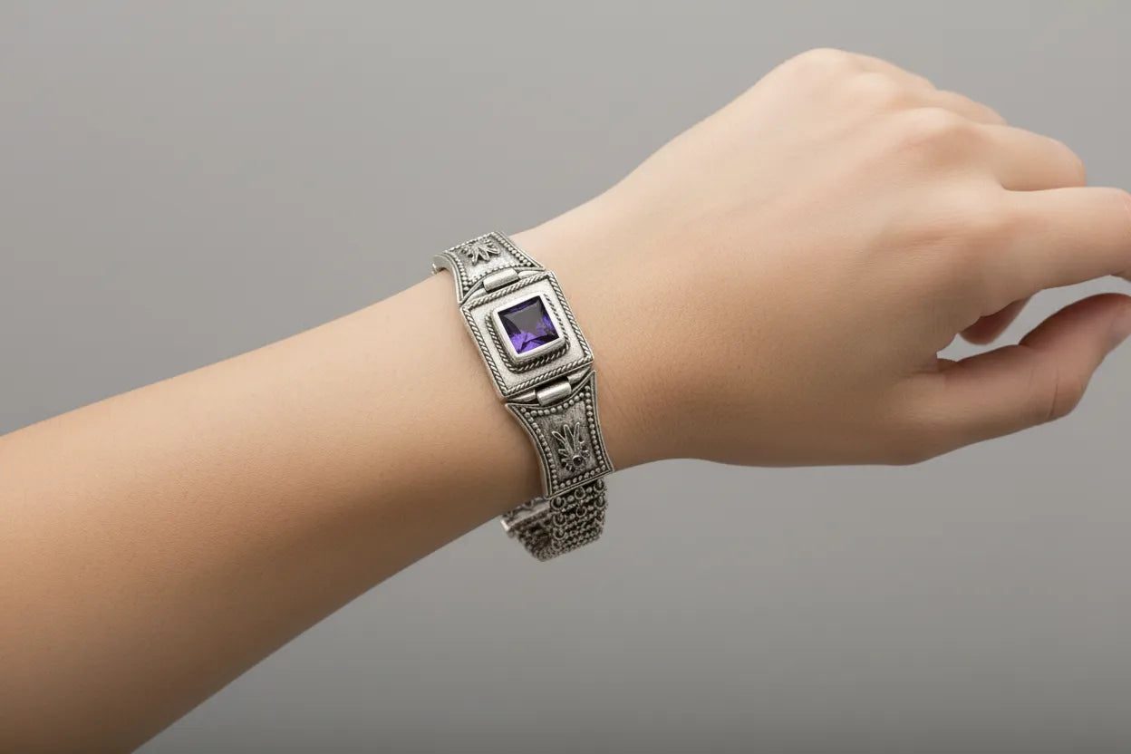 Χειροποίητο βραχιόλι από ασήμι που απεικονίζει τέλεια την ελληνική παραδοσιακή εποχή διακοσμημένο με πέτρα Ζιργκόν.
