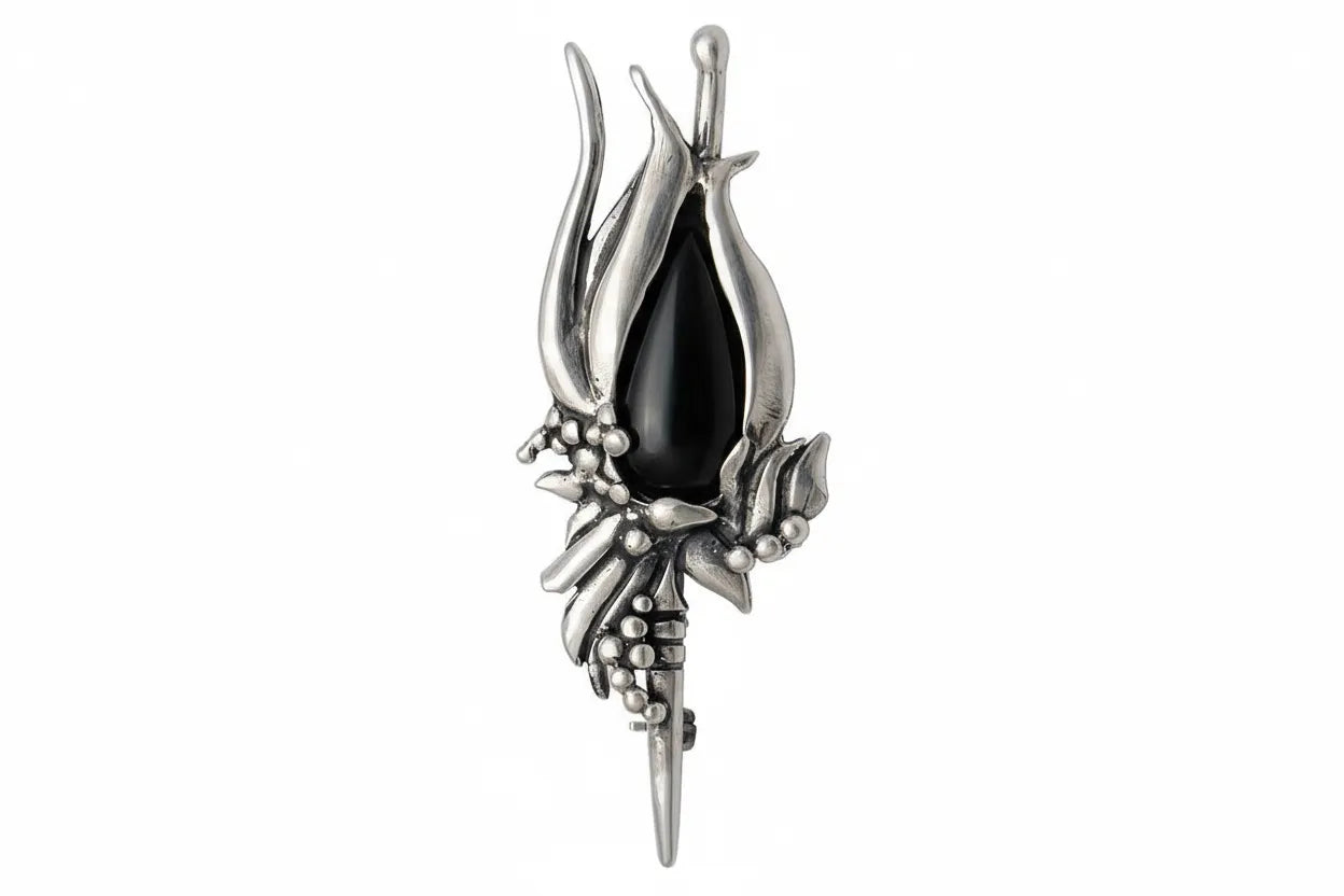 Ελληνική παραδοσιακή καρφίτσα λουλουδιών σε ασήμι 925 με μαύρη πέτρα (K-23)