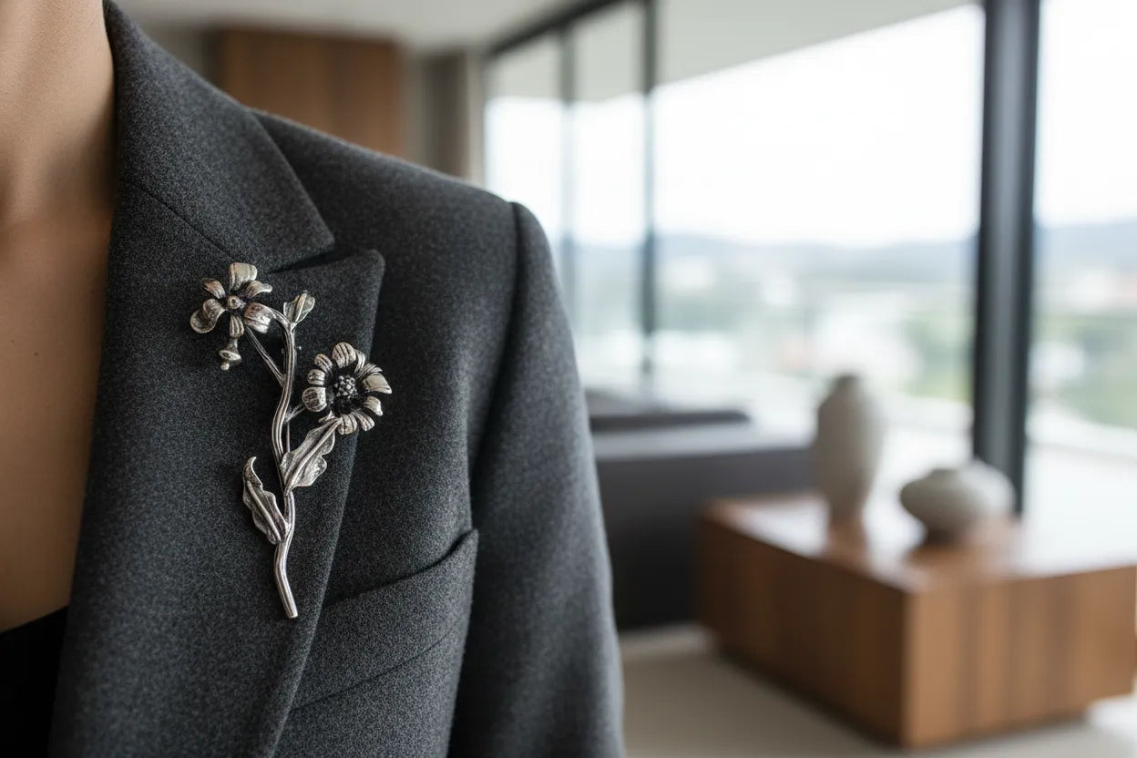 Χειροποίητη ασημένια καρφίτσα εμπνευσμένη από την ελληνική παράδοση.