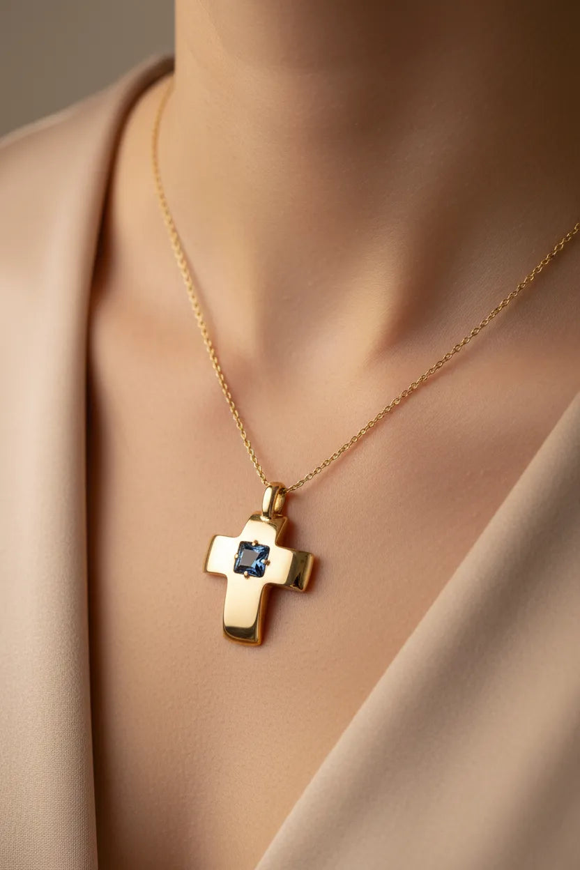 Χειροποίητος σταυρός από χρυσό 14 καρατίων διακοσμημένος με πέτρα ζιργκόν. Αυτός ο σταυρός μπορεί να φορεθεί ως σταυρός βάπτισης ή ως κόσμημα.