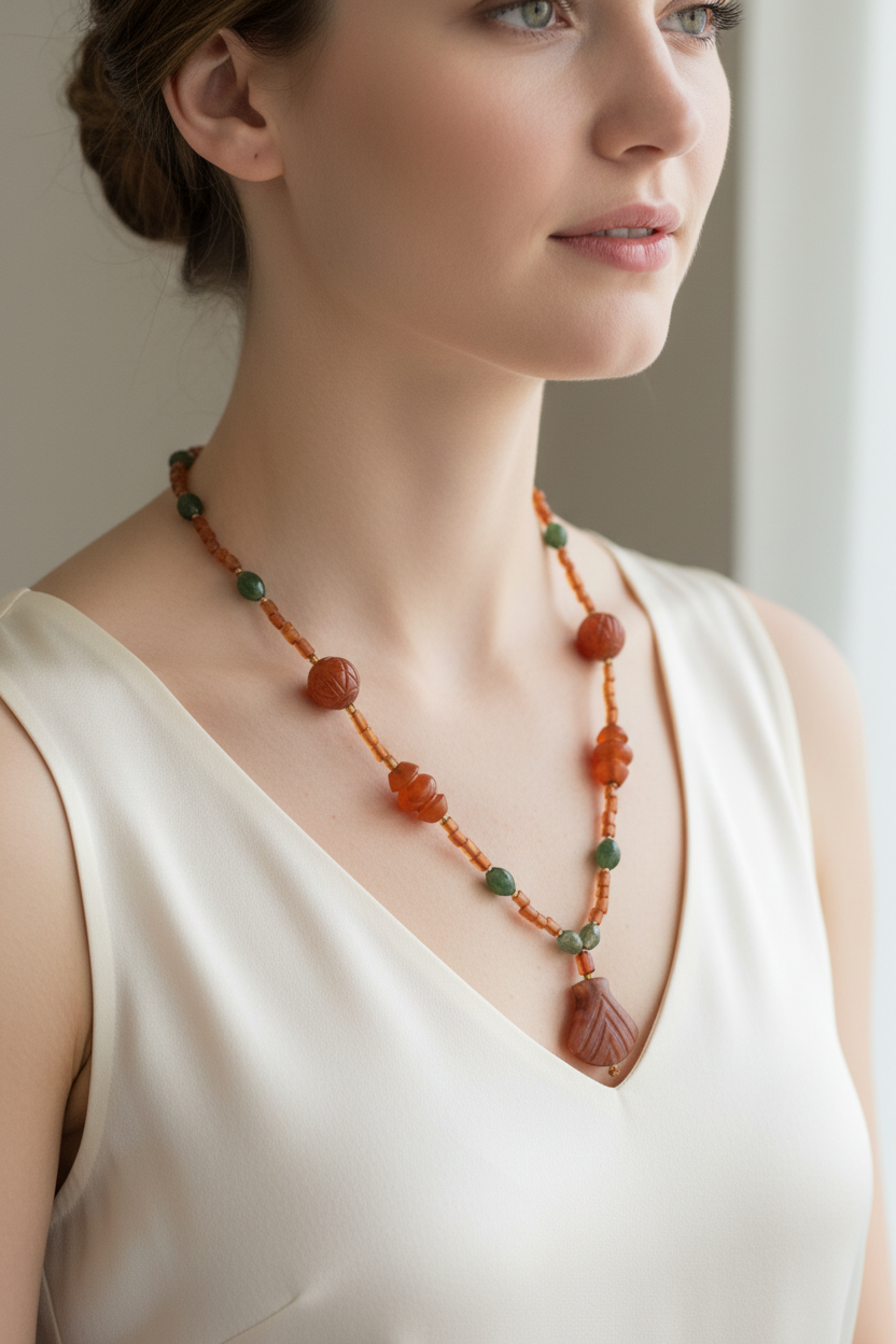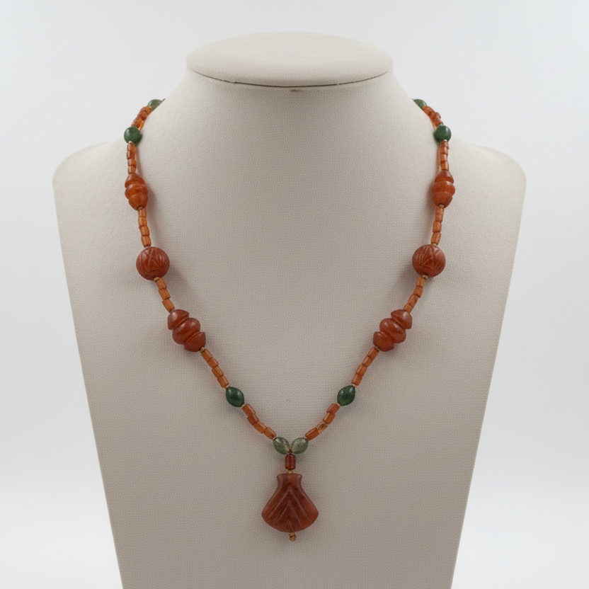 This one of a kind necklace featuring old carnelian and benzahir stones will add a touch of luxury to any outfit. Made with 18k gold elements, this fine jewelry piece is truly unique and exudes a sense of elegance and sophistication. Elevate your look with this beautiful necklace today!