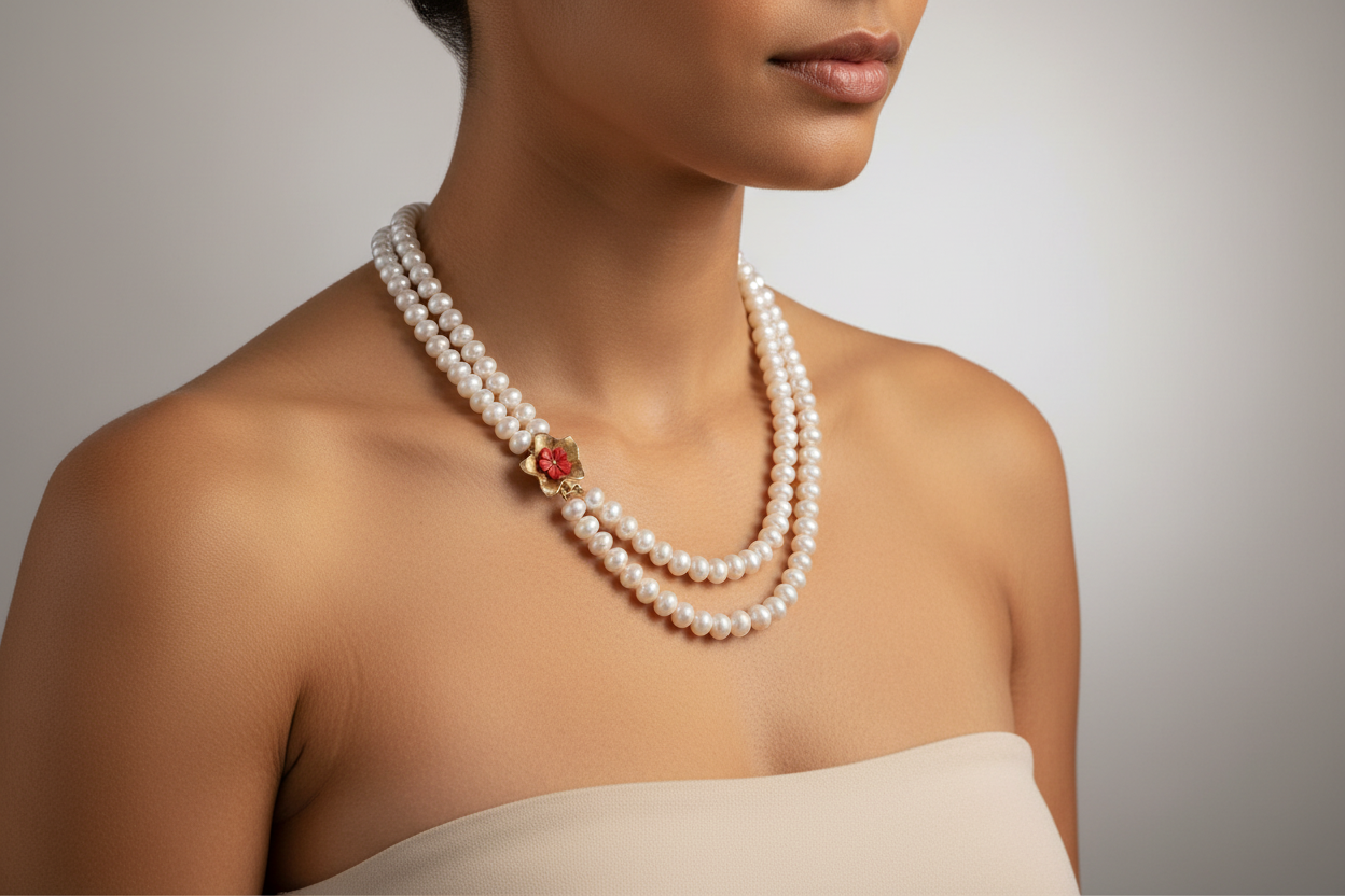 Elevate any outfit with our exquisite Necklace! Strung with two rows of lustrous pearls and embellished with 14k gold and a delicate flower design, this piece exudes elegance and luxury. Treat yourself or a loved one to a touch of glamour and sophistication.