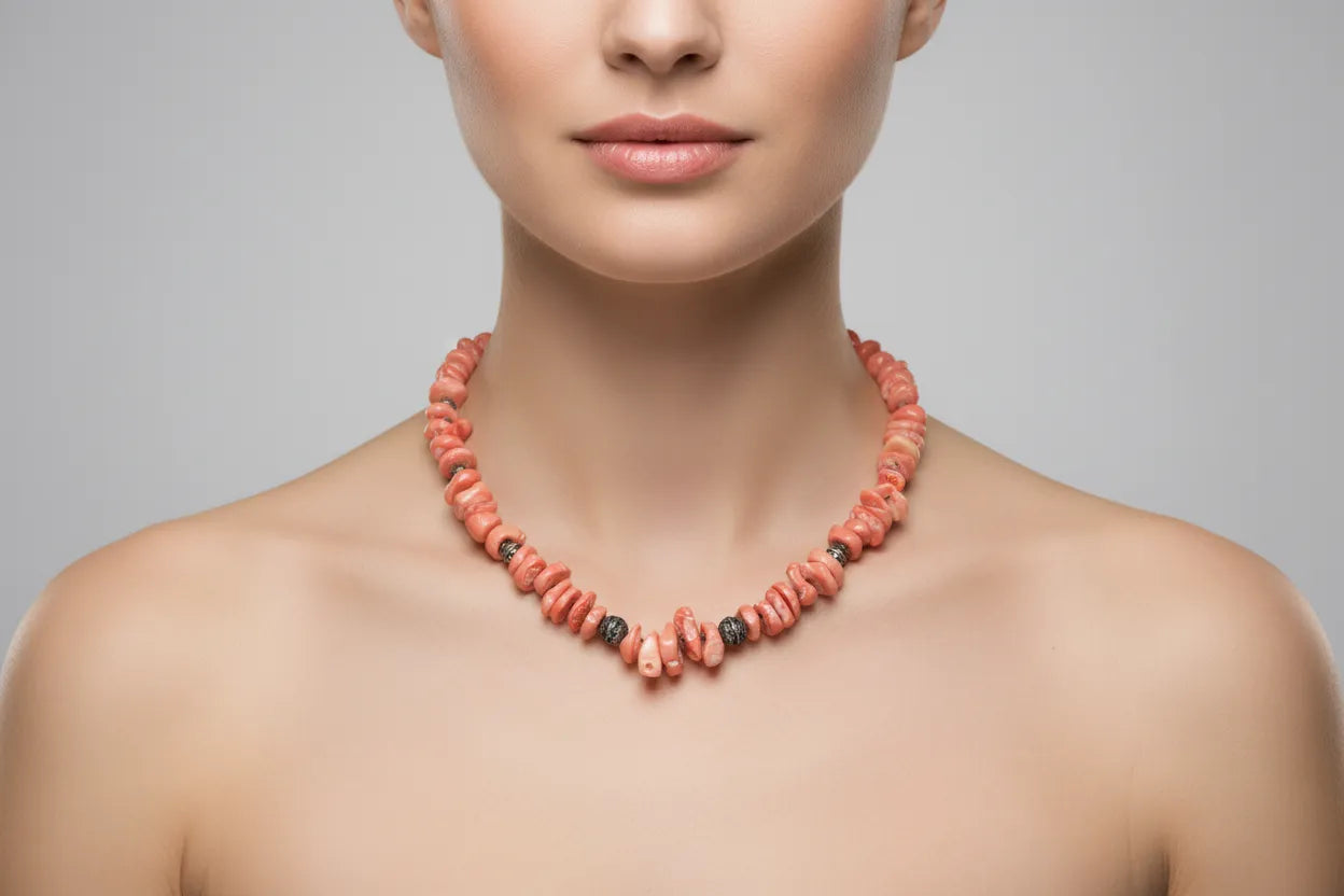 Αυτό το κλασικό κολιέ από ασήμι και ροζ κοραλλιογενείς πέτρες (δέρμα αγγέλου) είναι η τέλεια πινελιά κομψότητας. Το κούμπωμα τύπου εναλλαγής εξασφαλίζει ανθεκτικότητα και ασφαλή εφαρμογή. Ιδανικό για κάθε περίσταση.