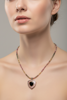 2: Experience the luxury and elegance of our 18k gold necklace adorned with multi-color tourmalines. Each gemstone is carefully selected to highlight the unique beauty of this piece. Enhance any outfit with the brilliant hues and intricate design of this stunning necklace. Elevate your style with our one-of-a-kind necklace.