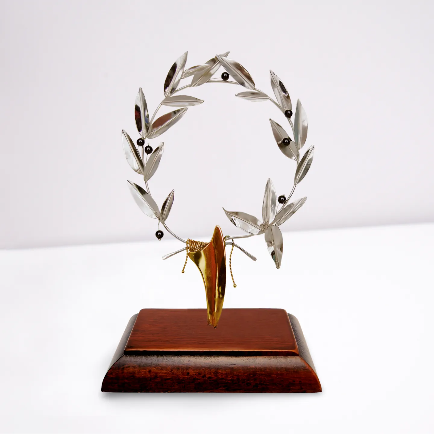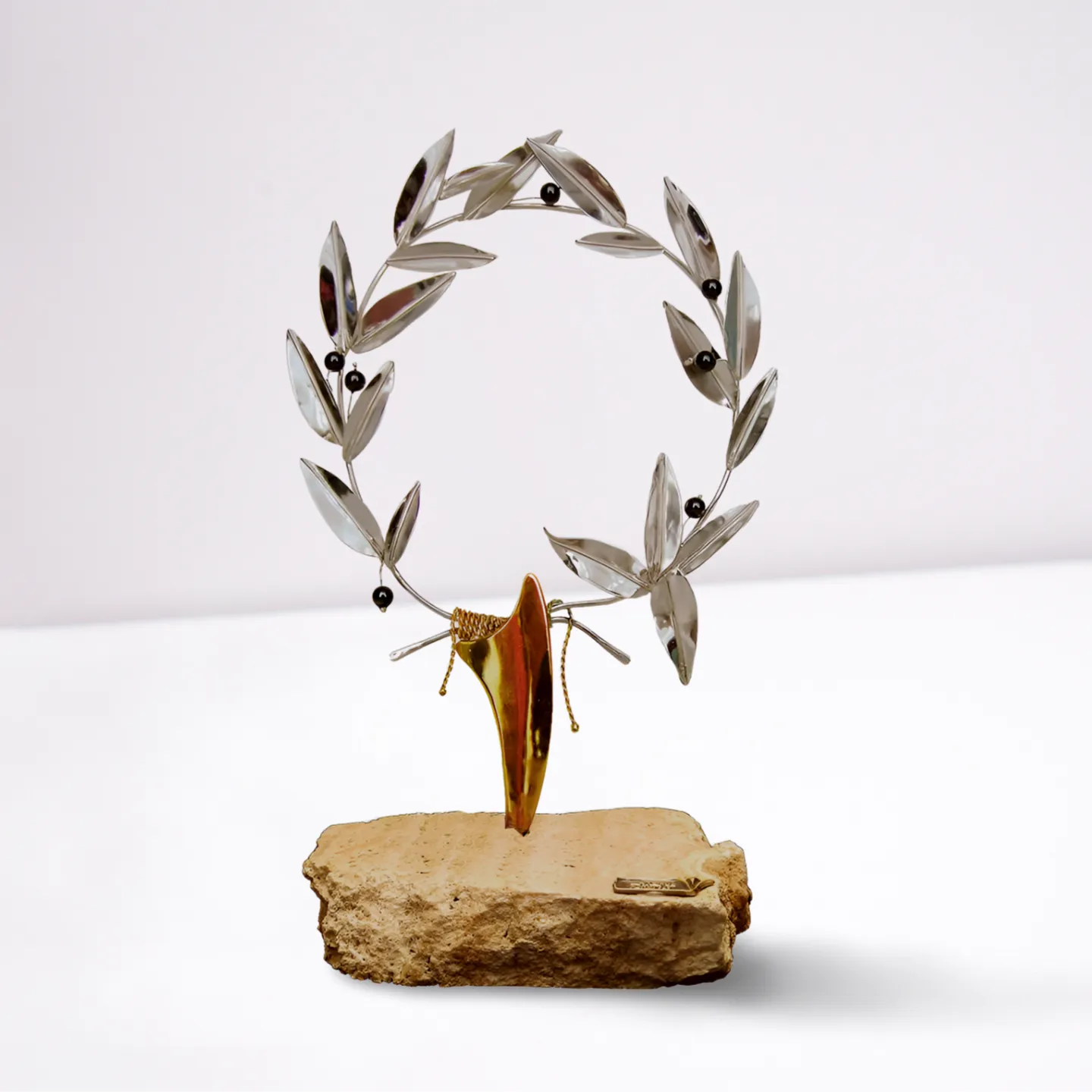 This handmade sterling silver wreath is decorated by hematite stones as olive mounted on a base of limestone and has the shape of wreath the Greek symbol of peace protection fertility and immortality. For the ancient Greeks the olive was a symbol of the Olympic ideals of peace wisdom and victory and this is captured in this handmade creation. It is a unique decorative object a remarkable and timeless gift for those who love symbolic luxury.