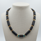 This stunning necklace is crafted with 18k gold elements and features black obsidian and turquoise stones. The combination of gold and gemstones adds an extra layer of luxury to any look, perfect for any special occasion.