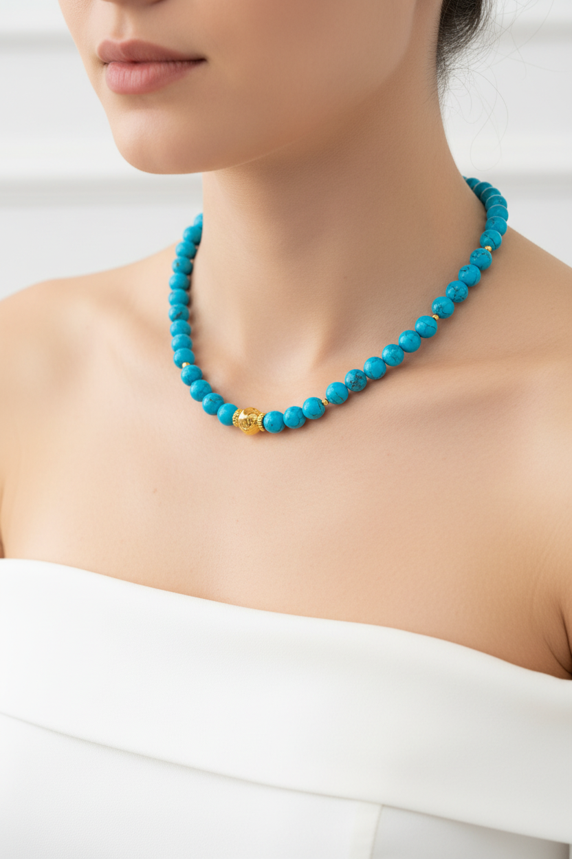 This statement necklace is crafted using turquoise stones and 18k gold elements. It adds a unique touch to any outfit, making it the perfect accessory for any special occasion. Featuring a dainty design, the necklace is the perfect combination of elegance and modern style.
