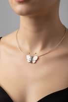 This exquisitely crafted necklace features a handmade gold chain and butterfly pendant, set with beautiful Mother of Pearl, Black Brilliants, and Sapphires. Make a statement and accessorize with this stunning piece of jewelry.