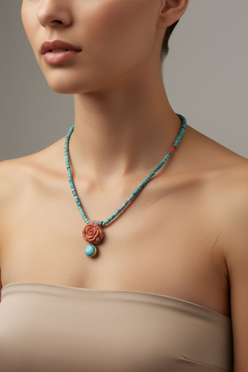 Enhance your outfit with our stunning Necklace in turquoise and coral stones, featuring a cascading rose design and elegantly crafted in 18k white gold. Stand out with this unique piece, perfect for any occasion!