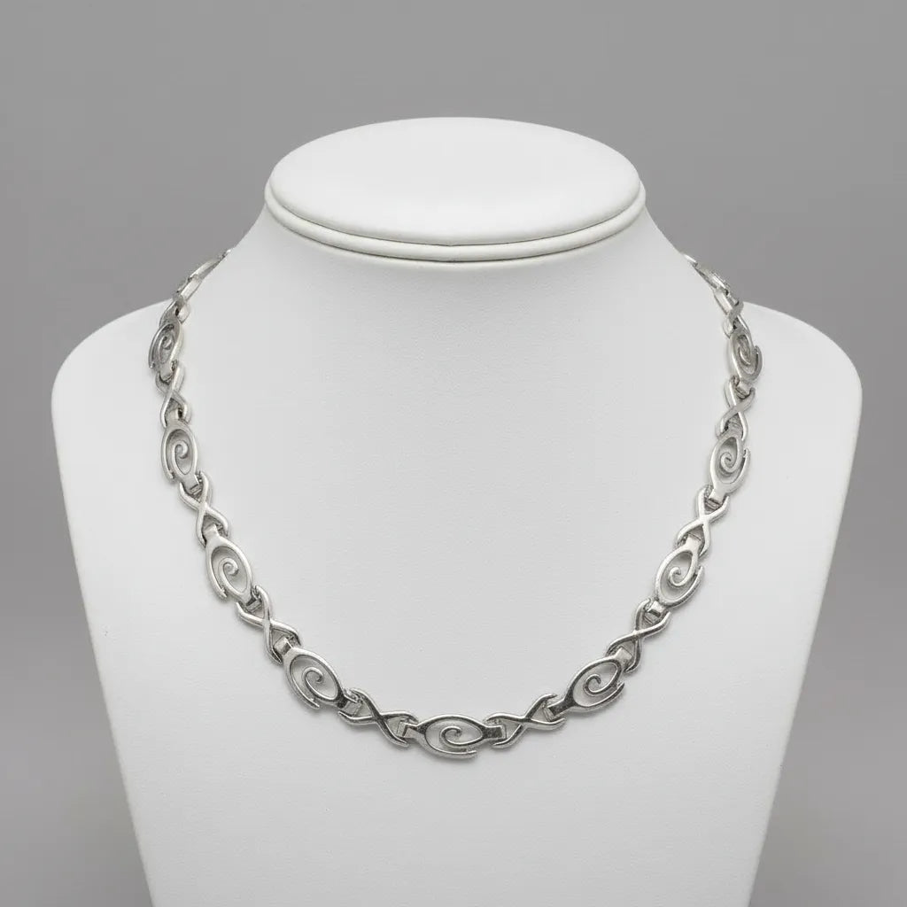 This handmade sterling silver jewelry necklace features the traditional Greek Spiral Motif a symbol of infinity of constant motion endlessness cut out around the entire necklace.