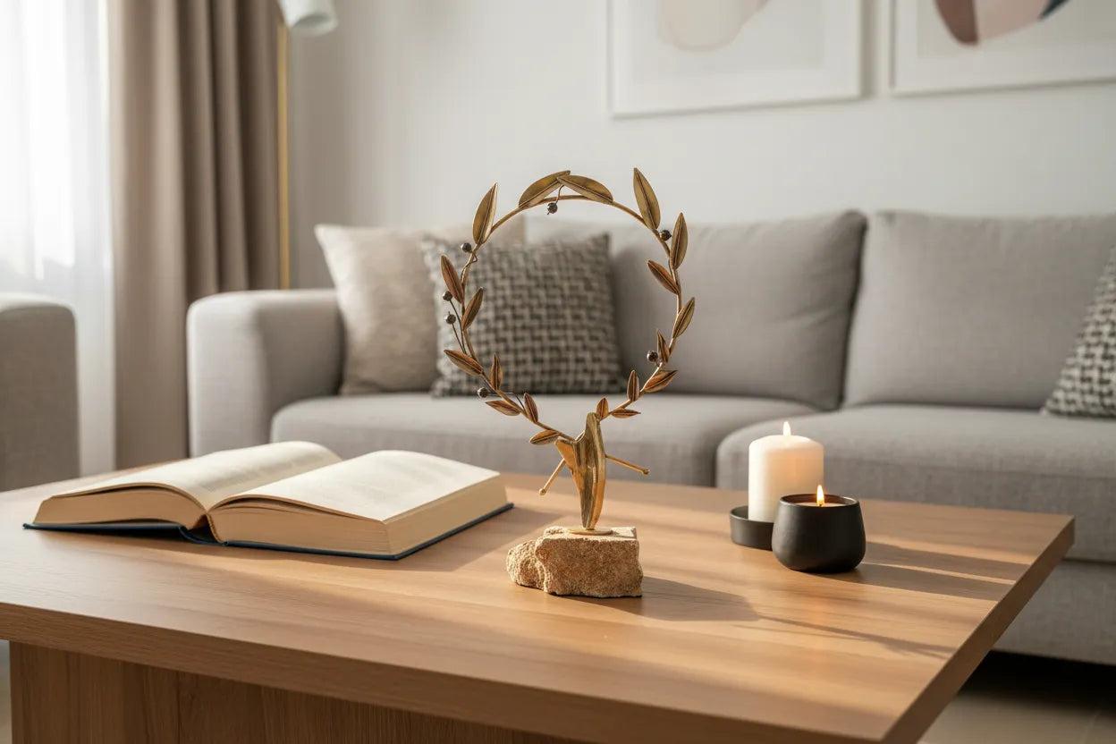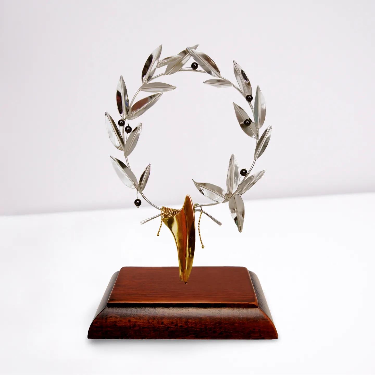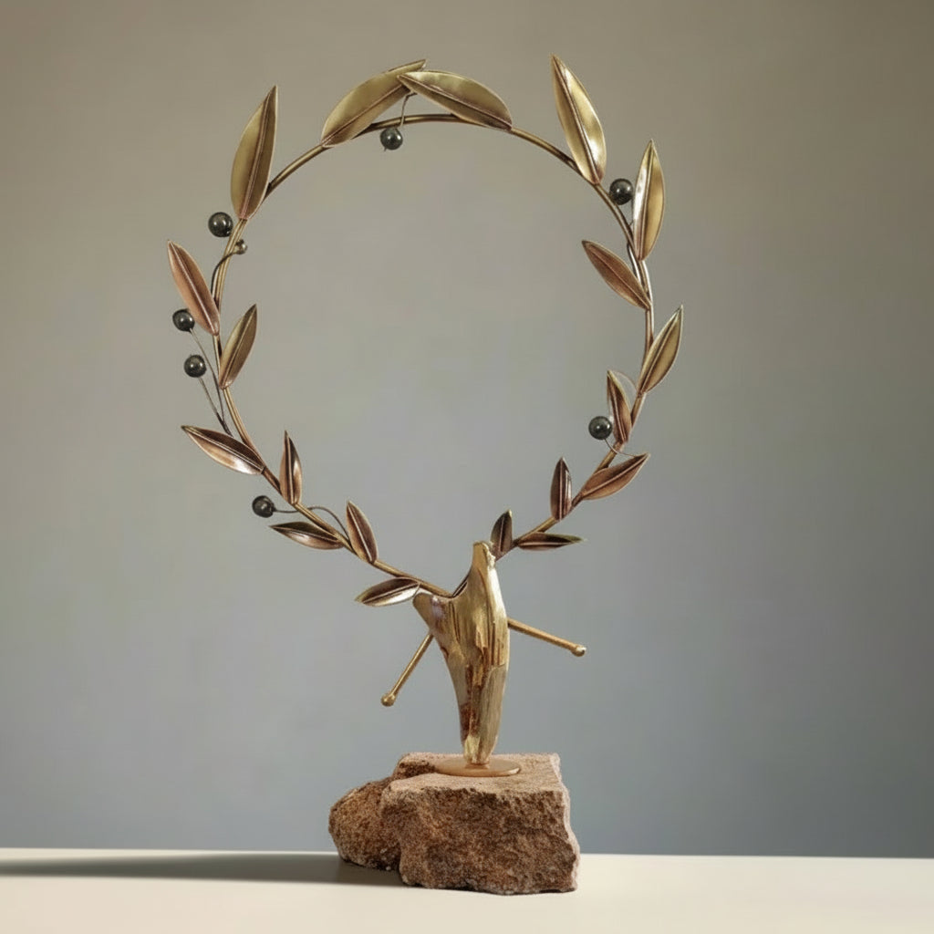 Entirely crafted in 925 sterling silver, each olive leaf is individually shaped and textured by skilled Greek artisans to capture the natural elegance and movement of real olive branches. The wreath is then carefully mounted on a solid limestone base, a material deeply connected to Greek history, architecture, and landscape or a solid natural wood base, chosen for its warmth, texture, and connection to the living olive tree — the source of the original kotinos.