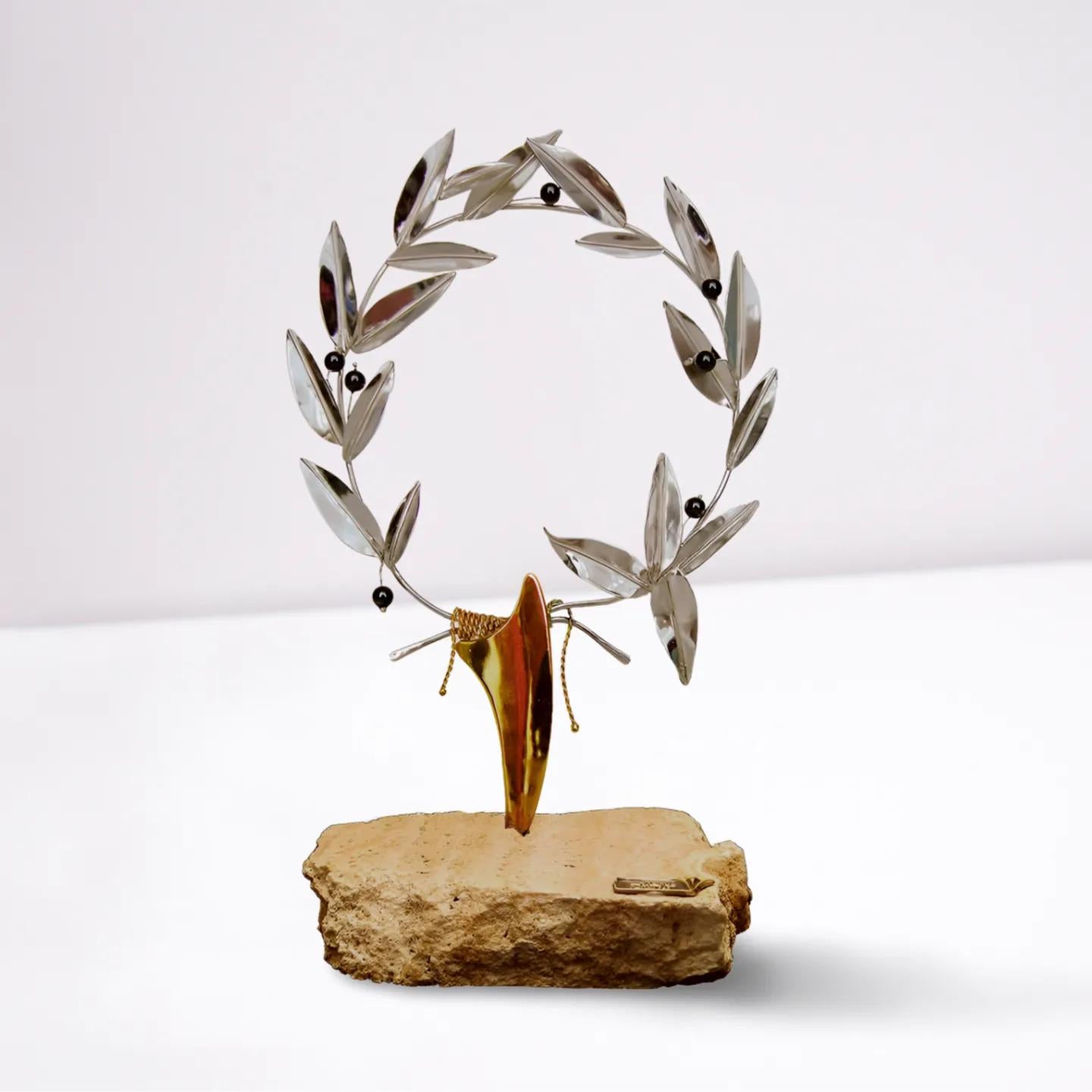 The contrast between the luminous silver wreath and the raw, natural texture of limestone creates a refined yet powerful aesthetic — blending ancient symbolism with contemporary design.