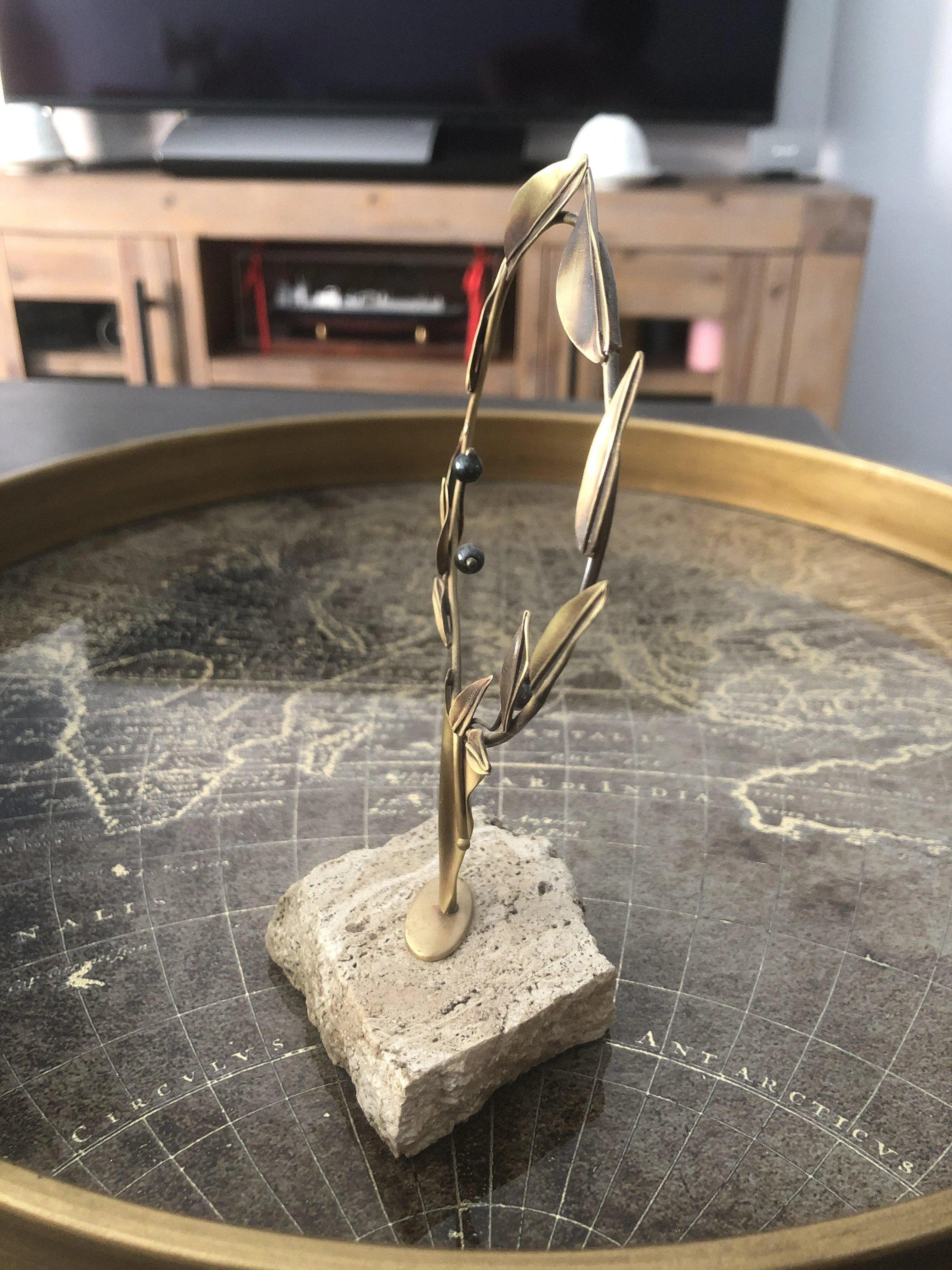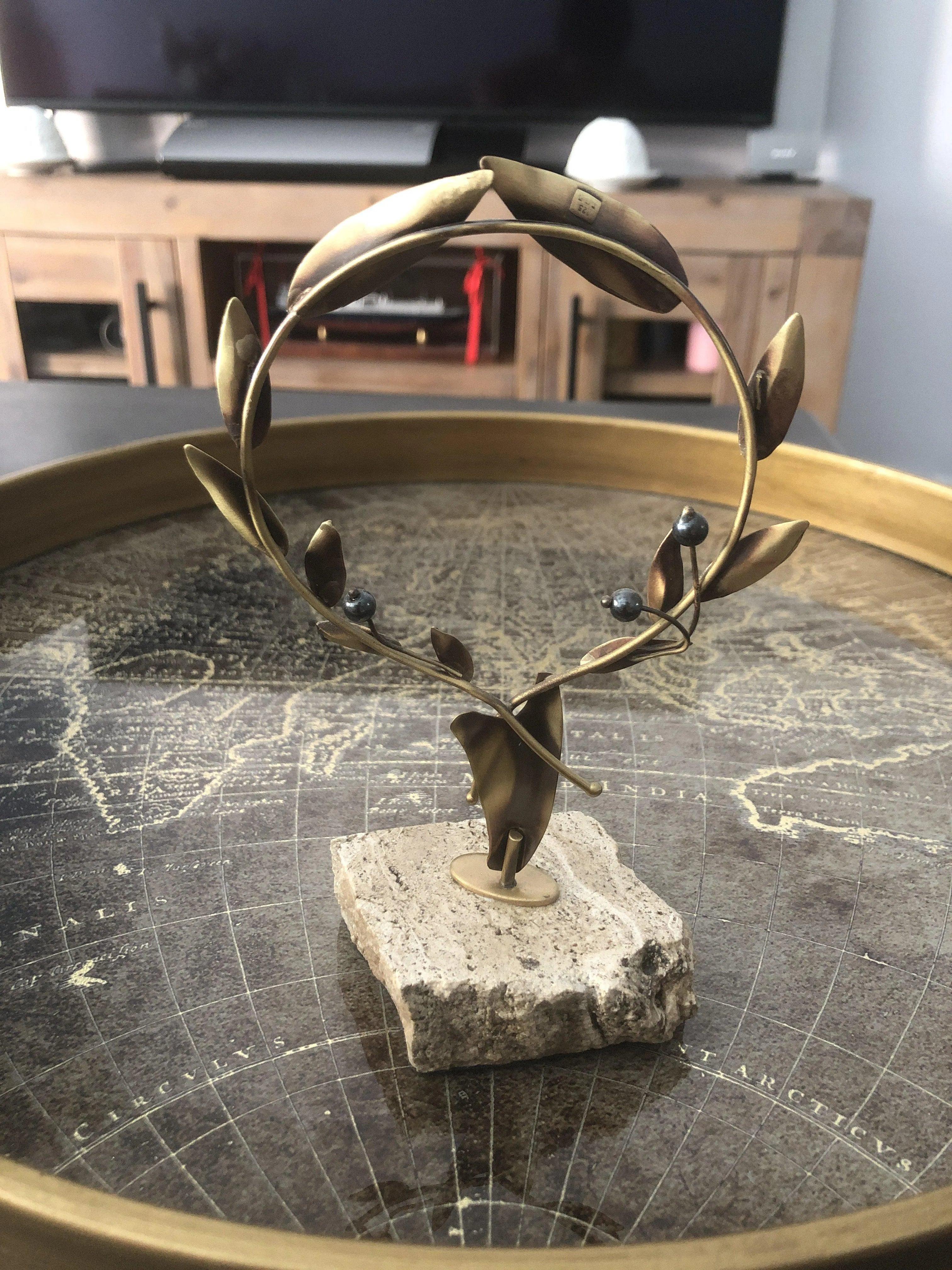 This handmade sterling silver olive wreath is decorated with olives from hematite stones and mounted on a base of limestone and has the shape of wreath the Greek symbol of peace protection fertility and immortality. For the ancient Greeks the olive was a symbol of the Olympic ideals of peace wisdom and victory and this is captured in this handmade creation. It is a unique decorative object a remarkable and timeless gift for those who love symbolic luxury.
