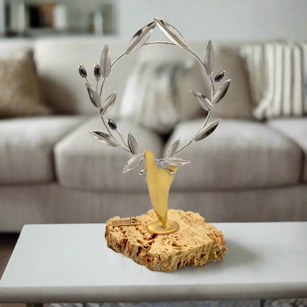Entirely crafted in 925 sterling silver, each olive leaf is individually shaped and textured by skilled Greek artisans to capture the natural elegance and movement of real olive branches. The wreath is then carefully mounted on a solid limestone base, a material deeply connected to Greek history, architecture, and landscape or a solid natural wood base, chosen for its warmth, texture, and connection to the living olive tree — the source of the original kotinos.