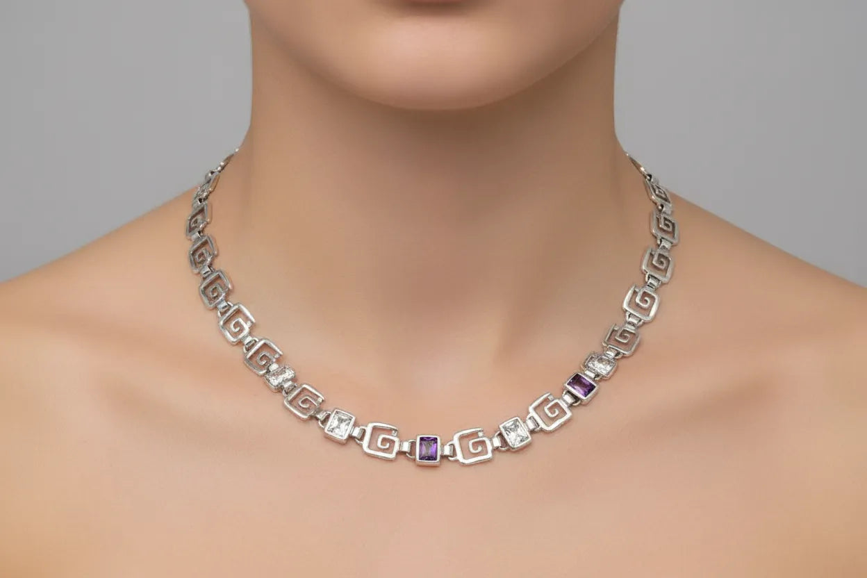 Greek Key Meander Necklace in Sterling Silver with zircon (PE-02)