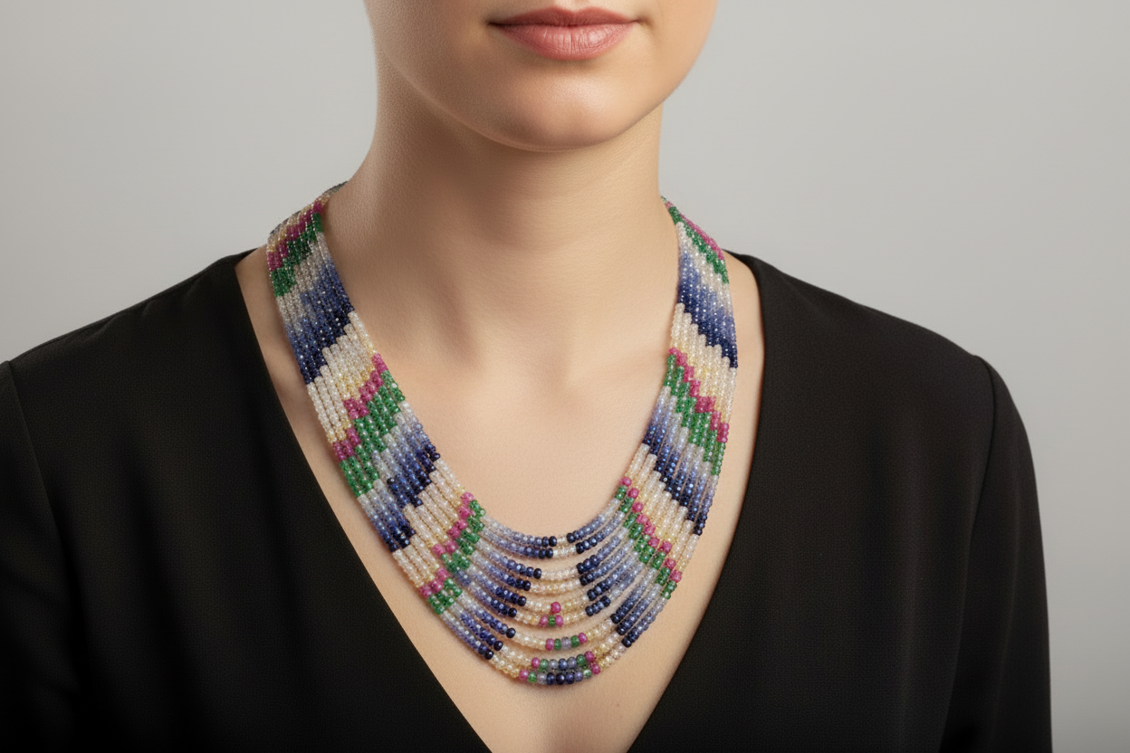 Necklaces in Pink Sapphire, Rubies, Emeralds gemstones & 18k gold elements
