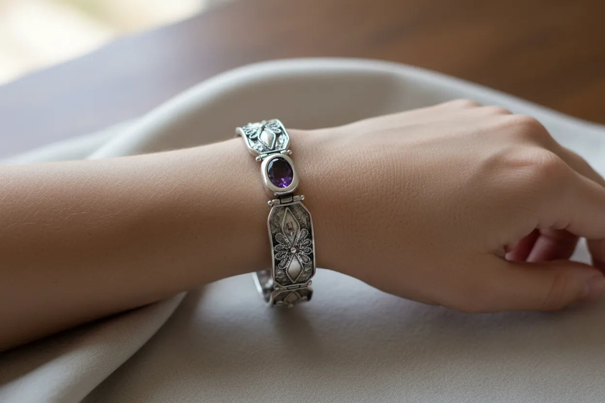 Hand Made Bracelet of Sterling Silver a perfect depict of the Greek traditional era decorated with Zircon stone.
